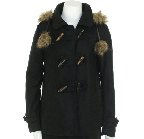Women's winter coat featuring a faux fur trim hood that is removable, button front with two pockets.