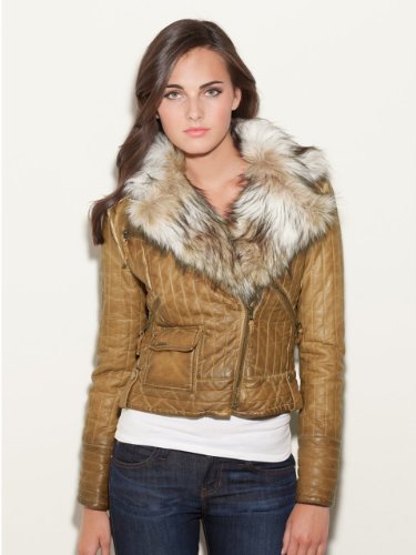 Quilted detail and faux-fur trim give this jacket need-now status. Subtle distressing on the soft faux leather adds an authentic, worn-in feel that completes your day-off looks. ? Removable notched faux-fur lapels. Long sleeves with zipper closures. ? Quilted detail throughout. Three zipper pockets. Single patch pocket at lower right. Button tabs along hem. ? Off-center zipper closure. Lined. ? 100% Polyurethane. Lining: 100% Polyester. Faux Fur: 59% Modacrylic, 27% Acrylic, 14% Polyester. ? Dry clean Women > Jackets & Outerwear